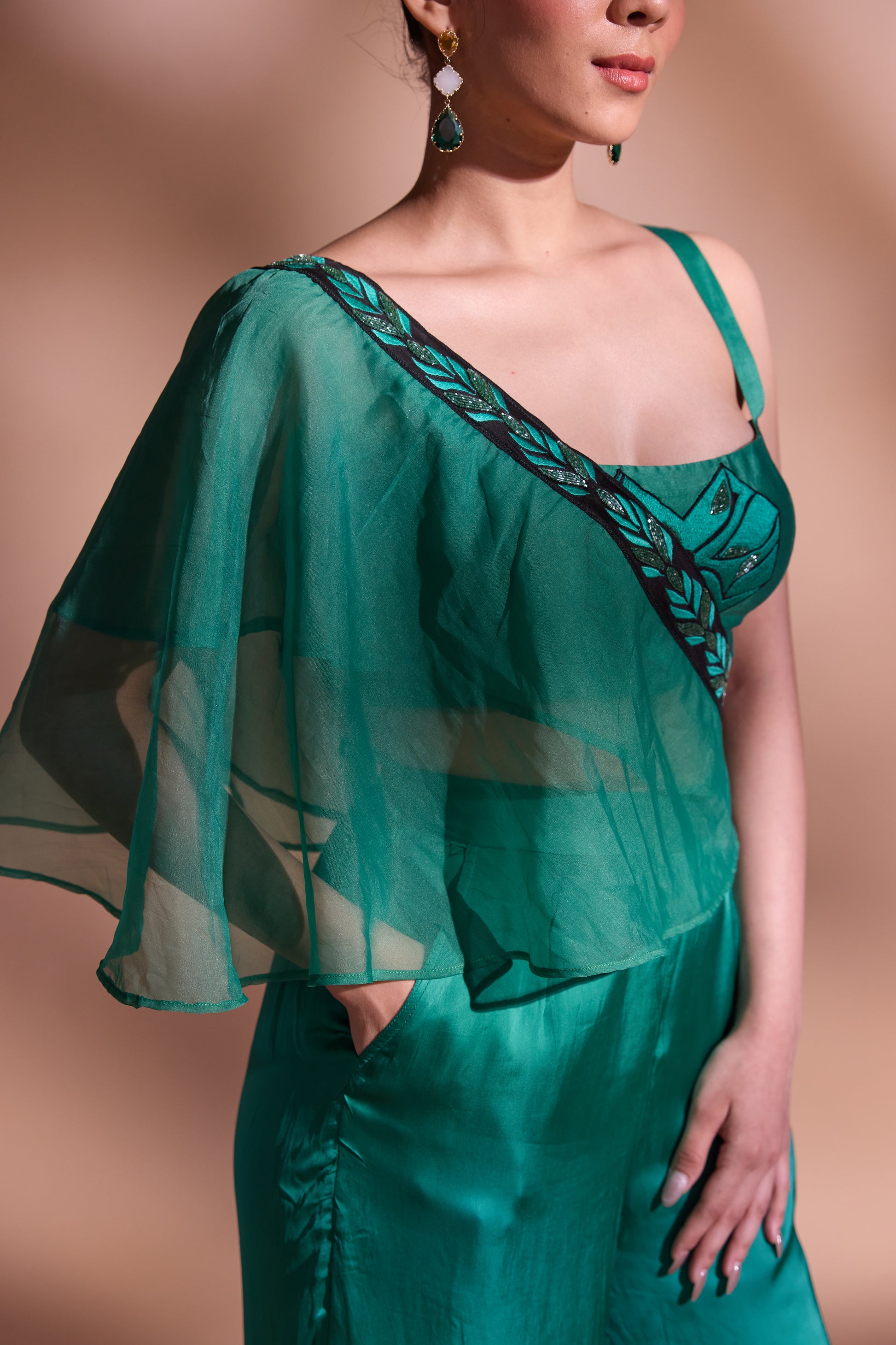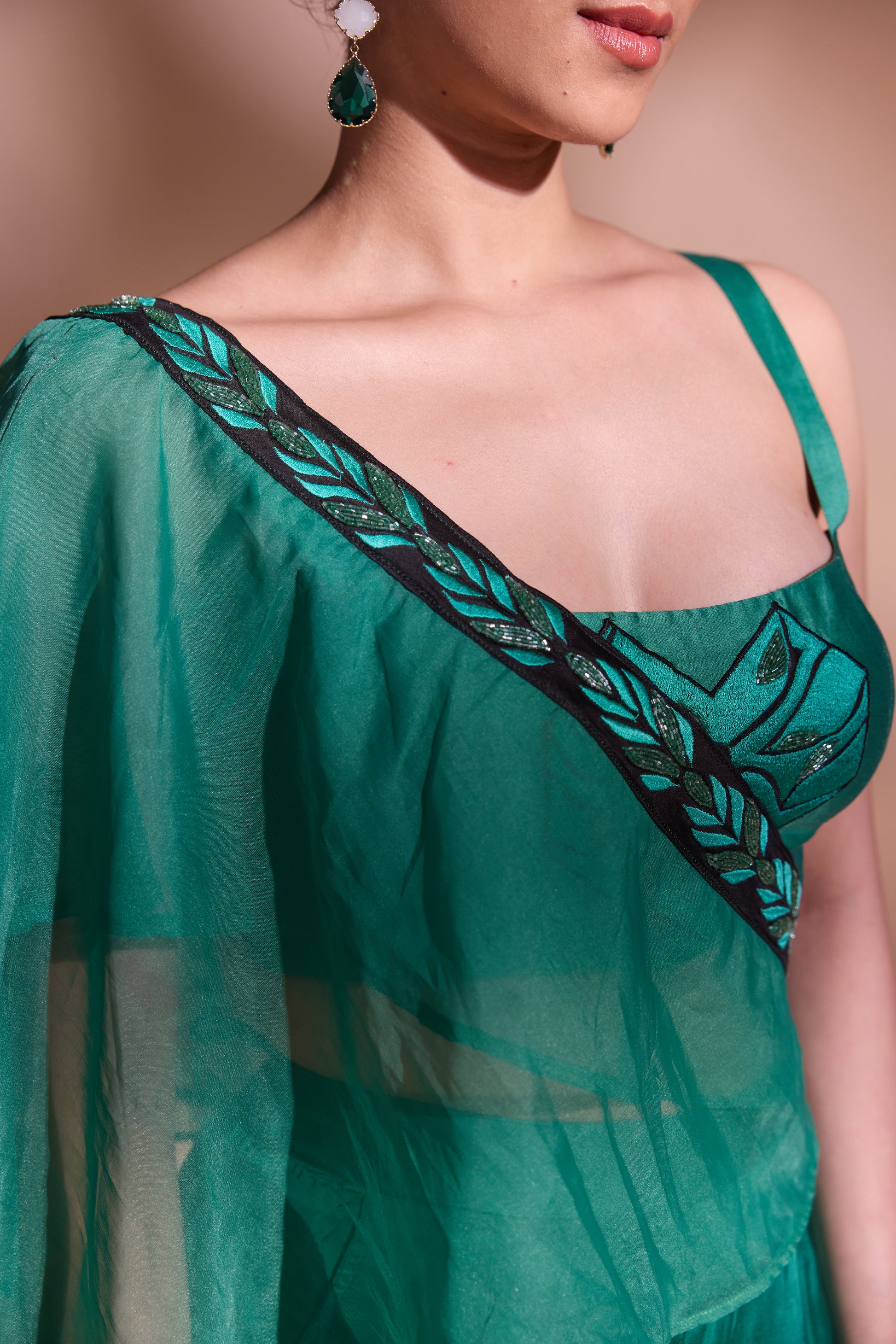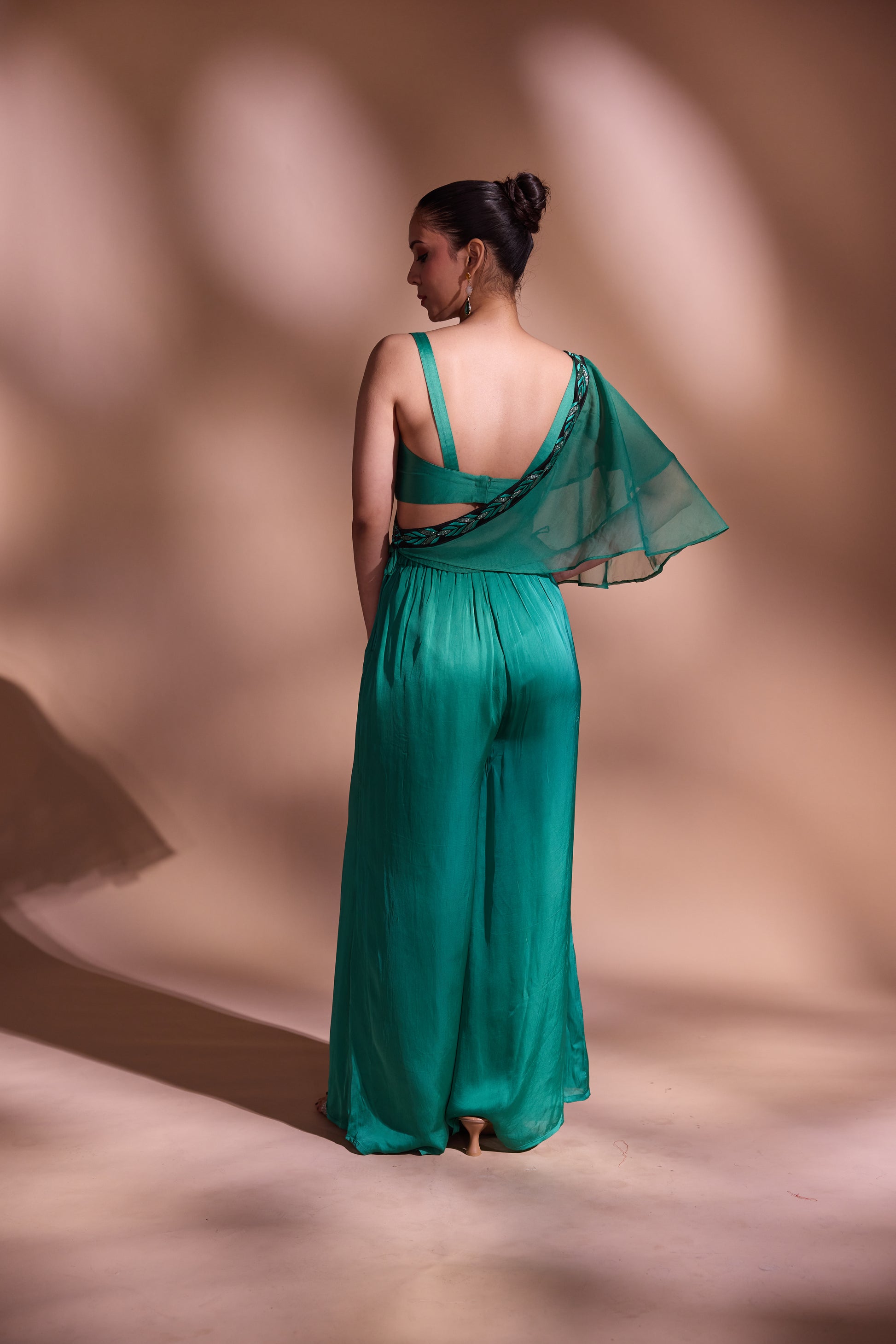 flow. The highlight is the attached silk organza drape, finished with a hand-embroidered border, adding a graceful flourish to the look. Made in luxurious georgette satin, this ensemble is perfect for evening soirées, destination celebrations, or contemporary festive dressing.