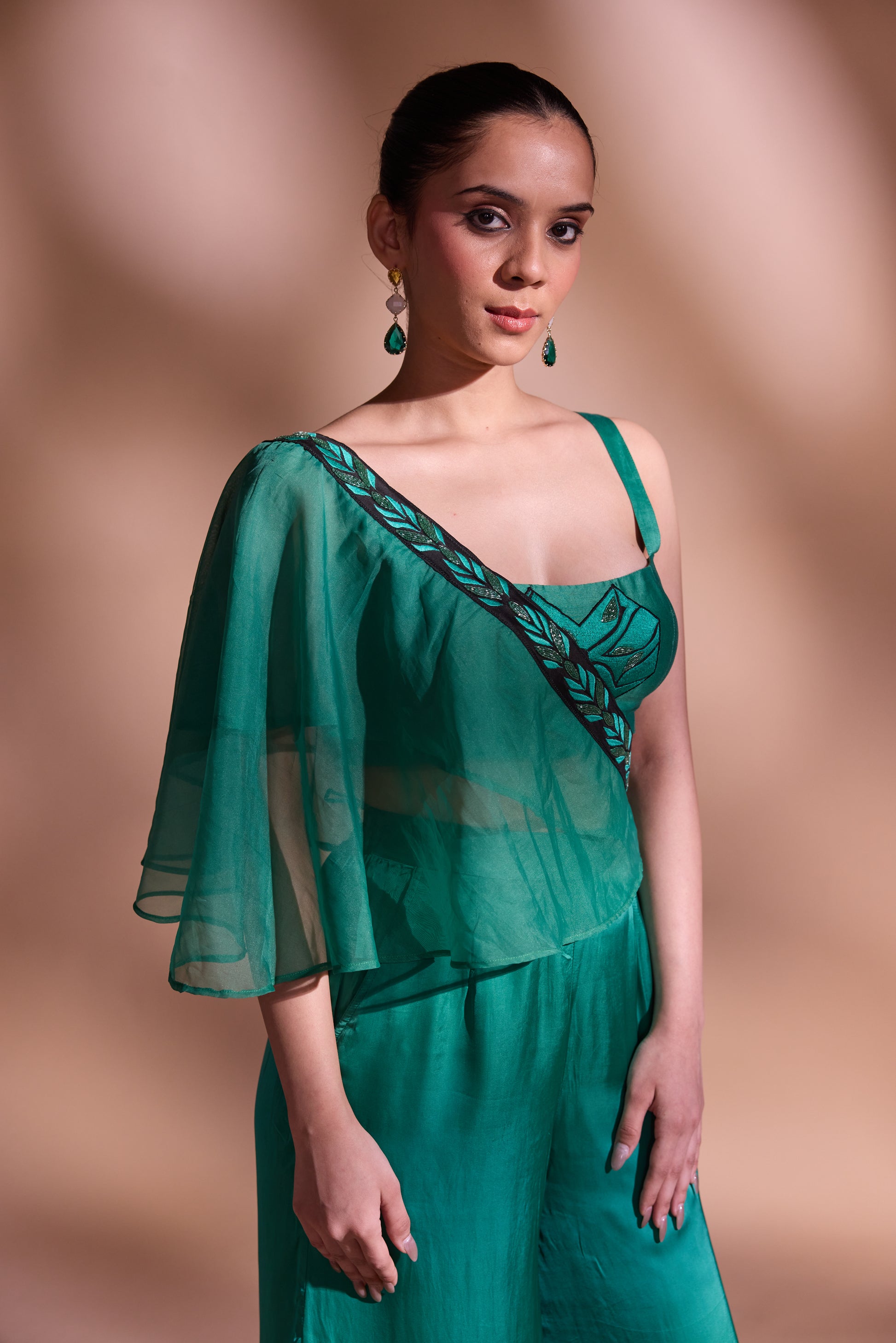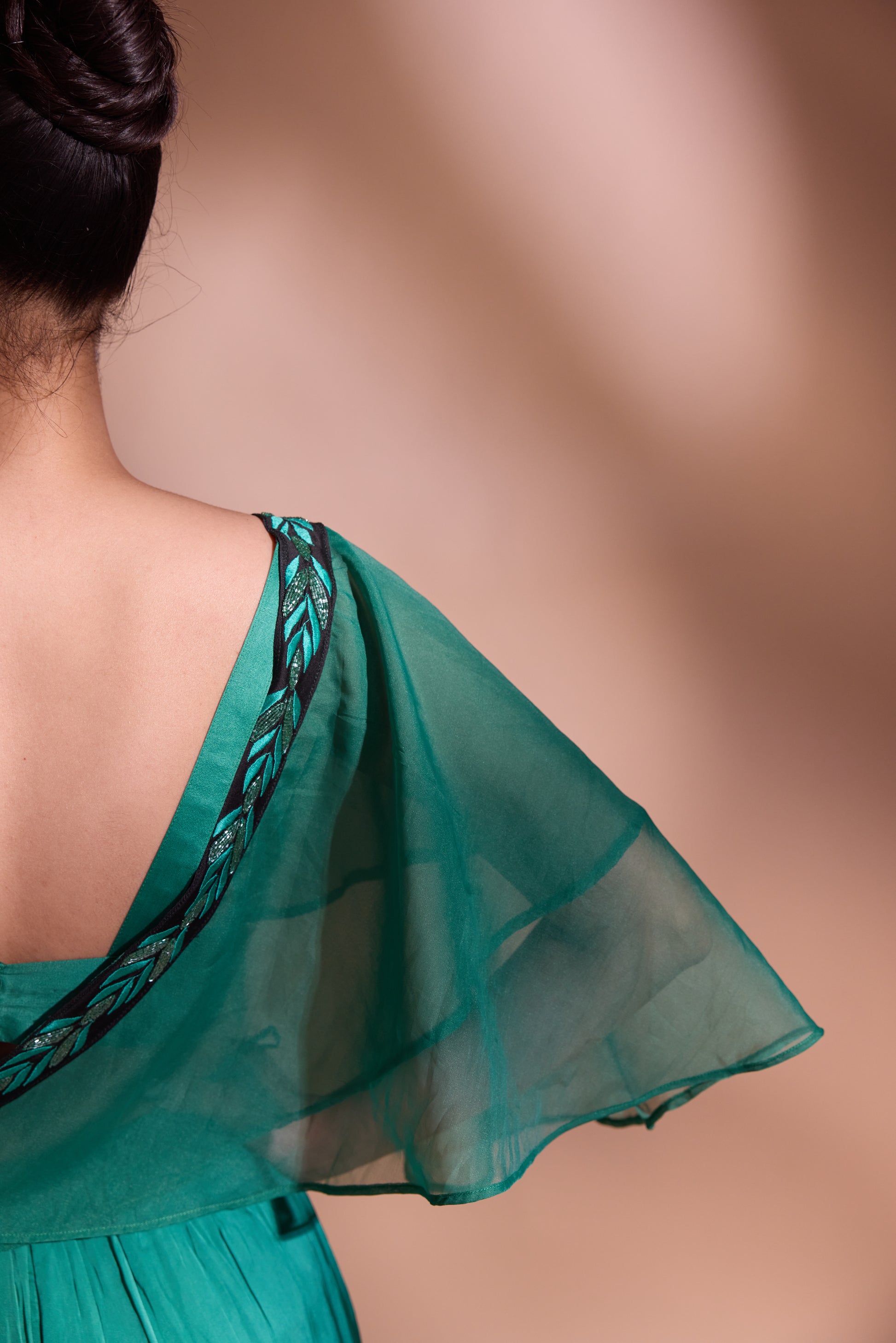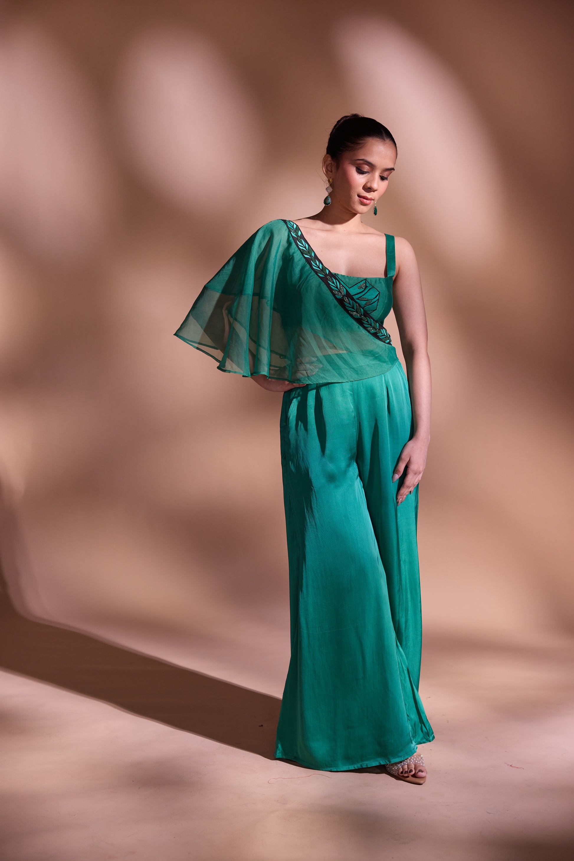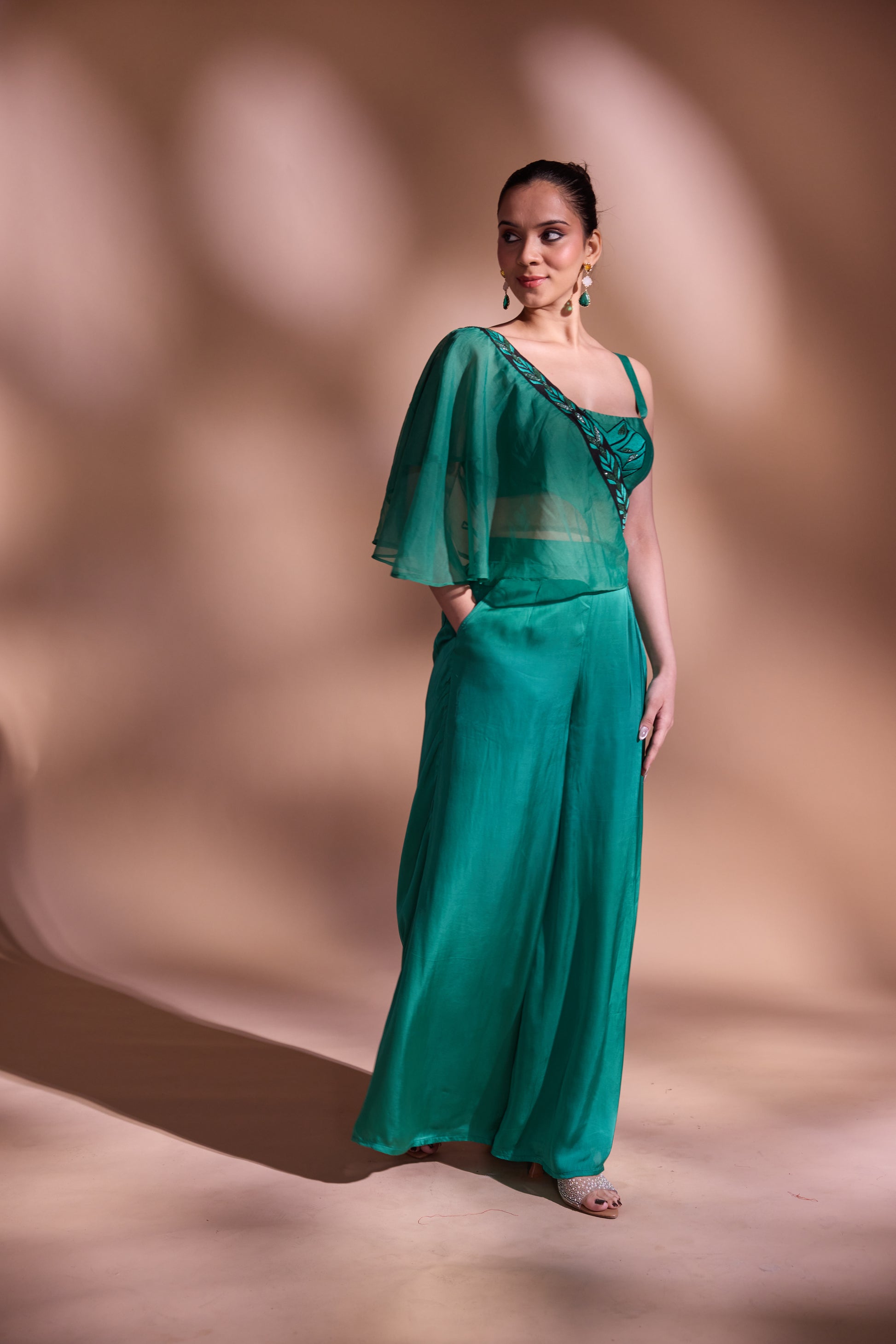 flow. The highlight is the attached silk organza drape, finished with a hand-embroidered border, adding a graceful flourish to the look. Made in luxurious georgette satin, this ensemble is perfect for evening soirées, destination celebrations, or contemporary festive dressing.