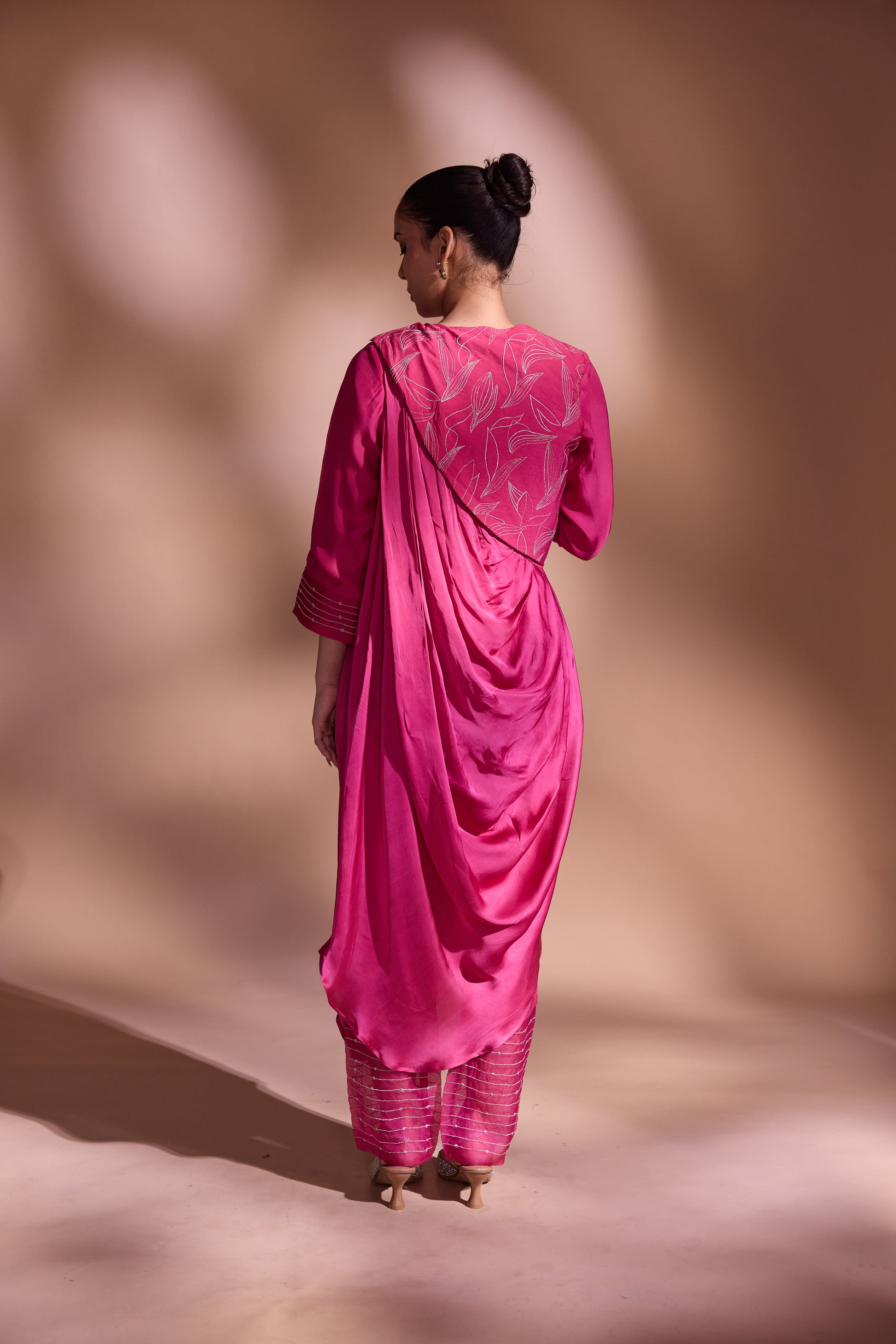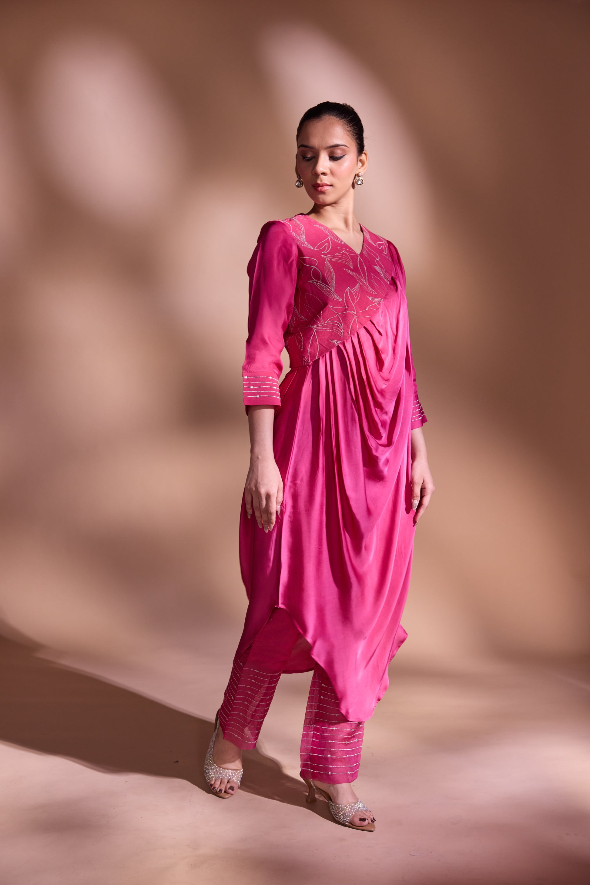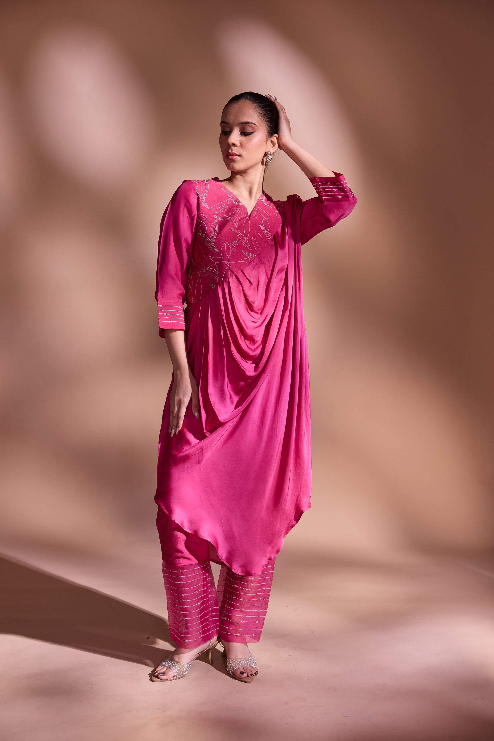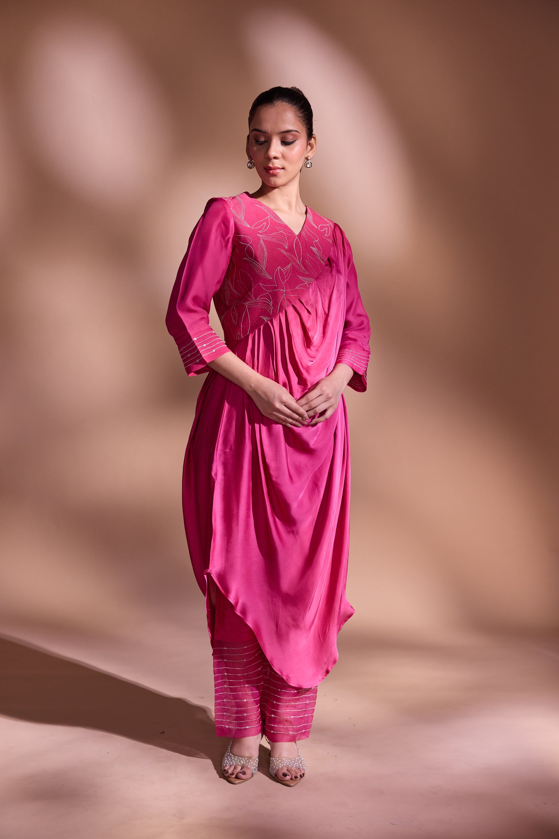 Elevate your ethnic wardrobe with this exquisite Asymmetrical Zari Embroidered Cowl Kurta Set, crafted in luxurious Georgette Satin for a rich and graceful drape. The kurta features a unique asymmetrical silhouette with elegant zari embroidery that adds a touch of opulence to the cowl design. Intricate embroidered detailing on the sleeves enhances its festive appeal, making it perfect for special occasions. Paired with straight-cut pants adorned with delicate embroidery on the hem, this ensemble blends tradition with