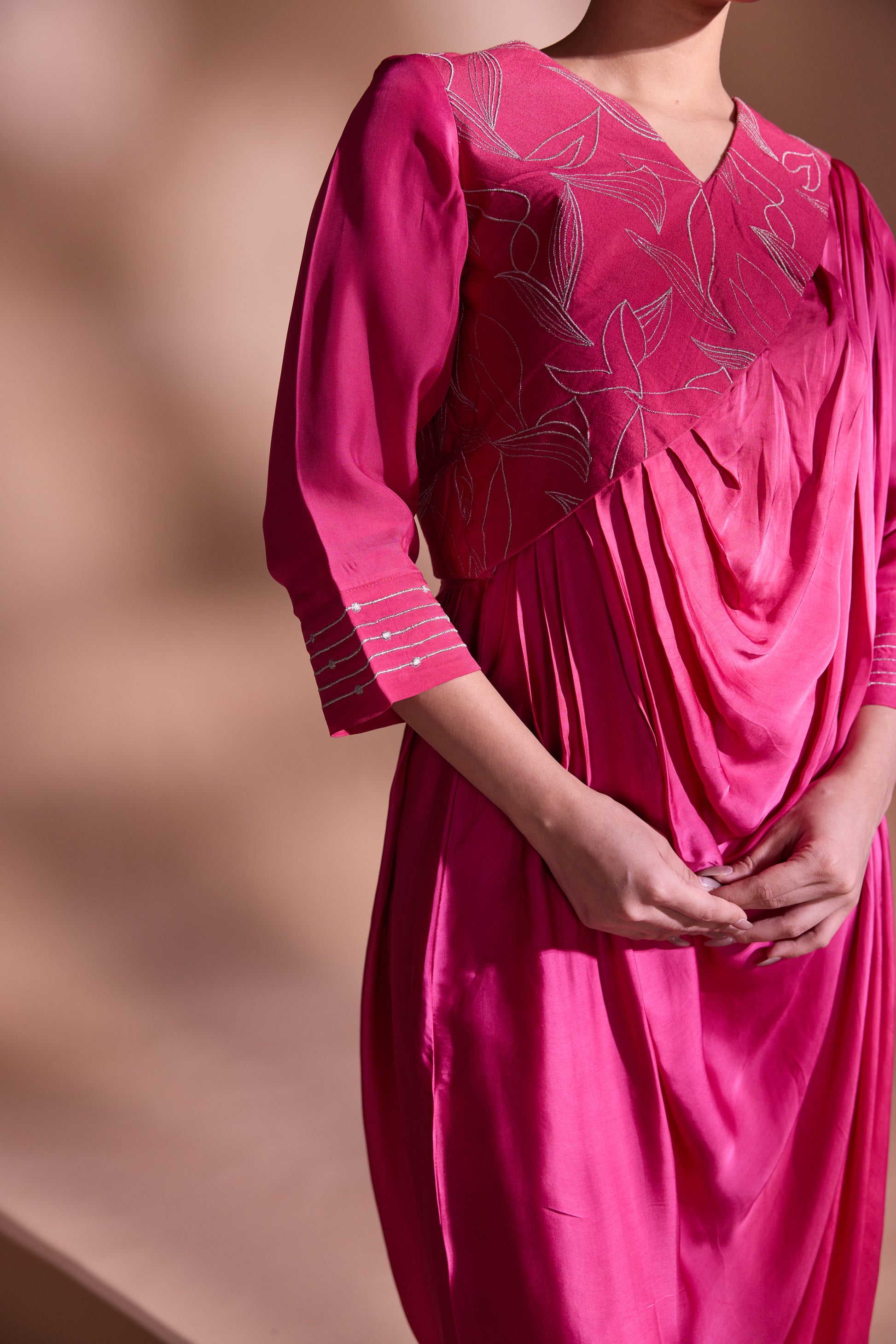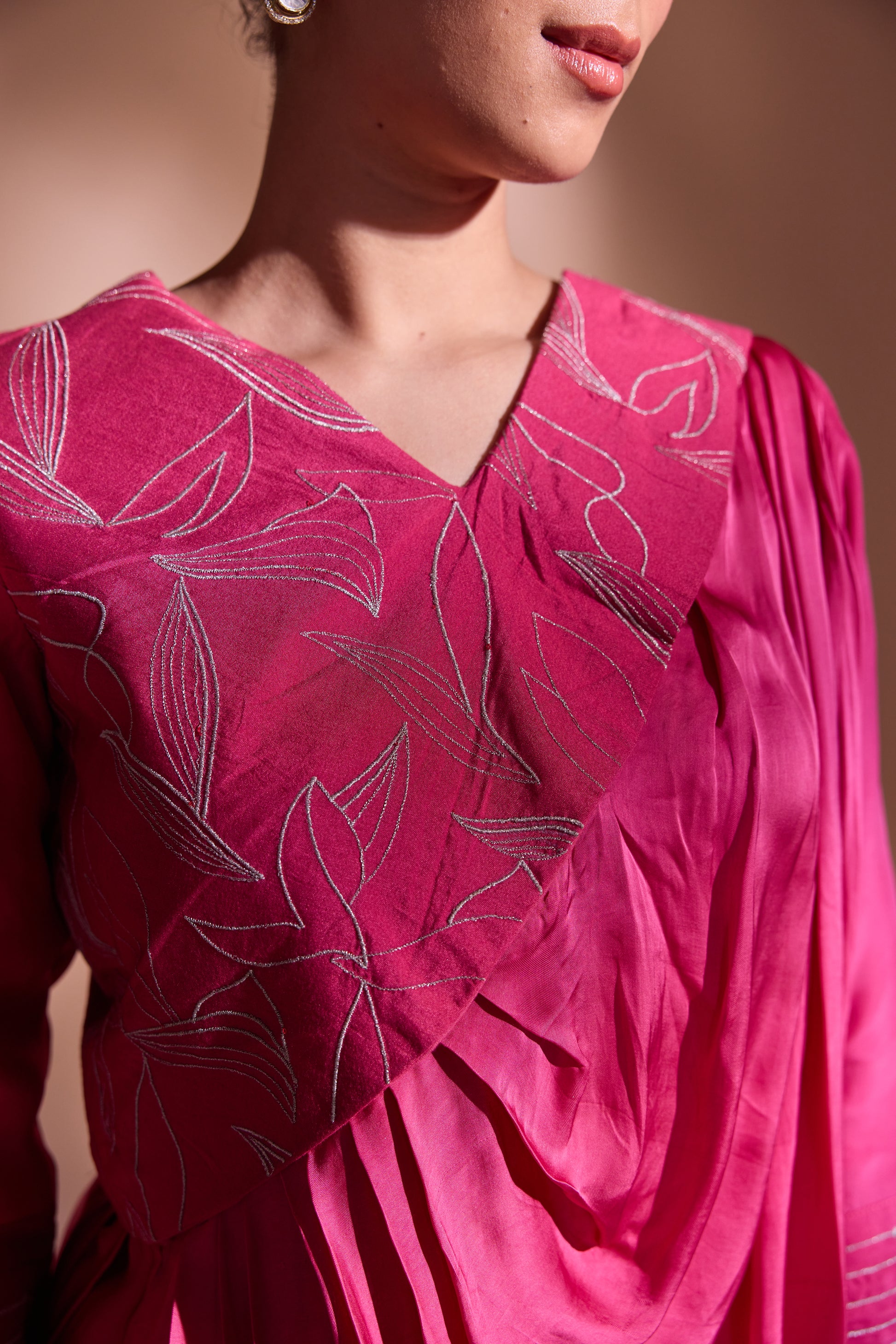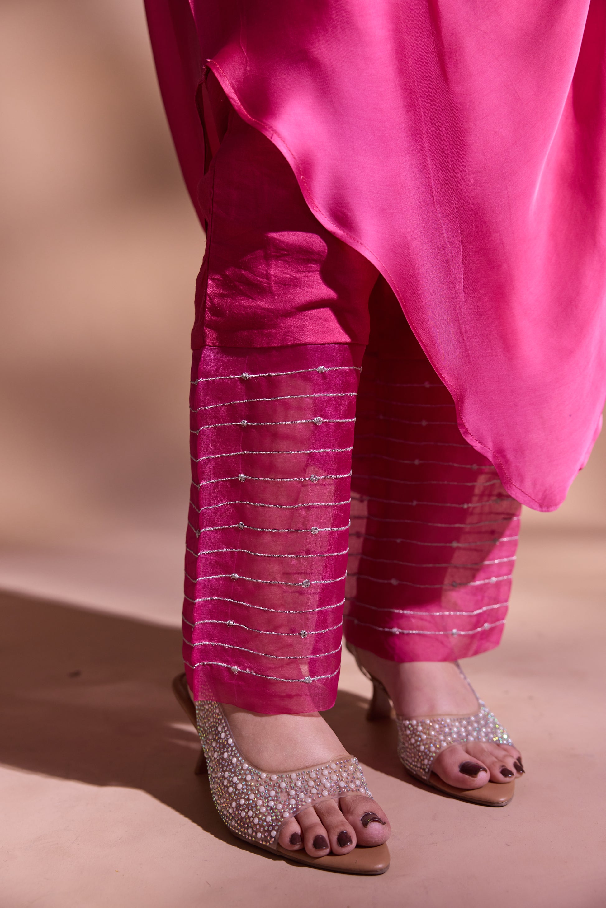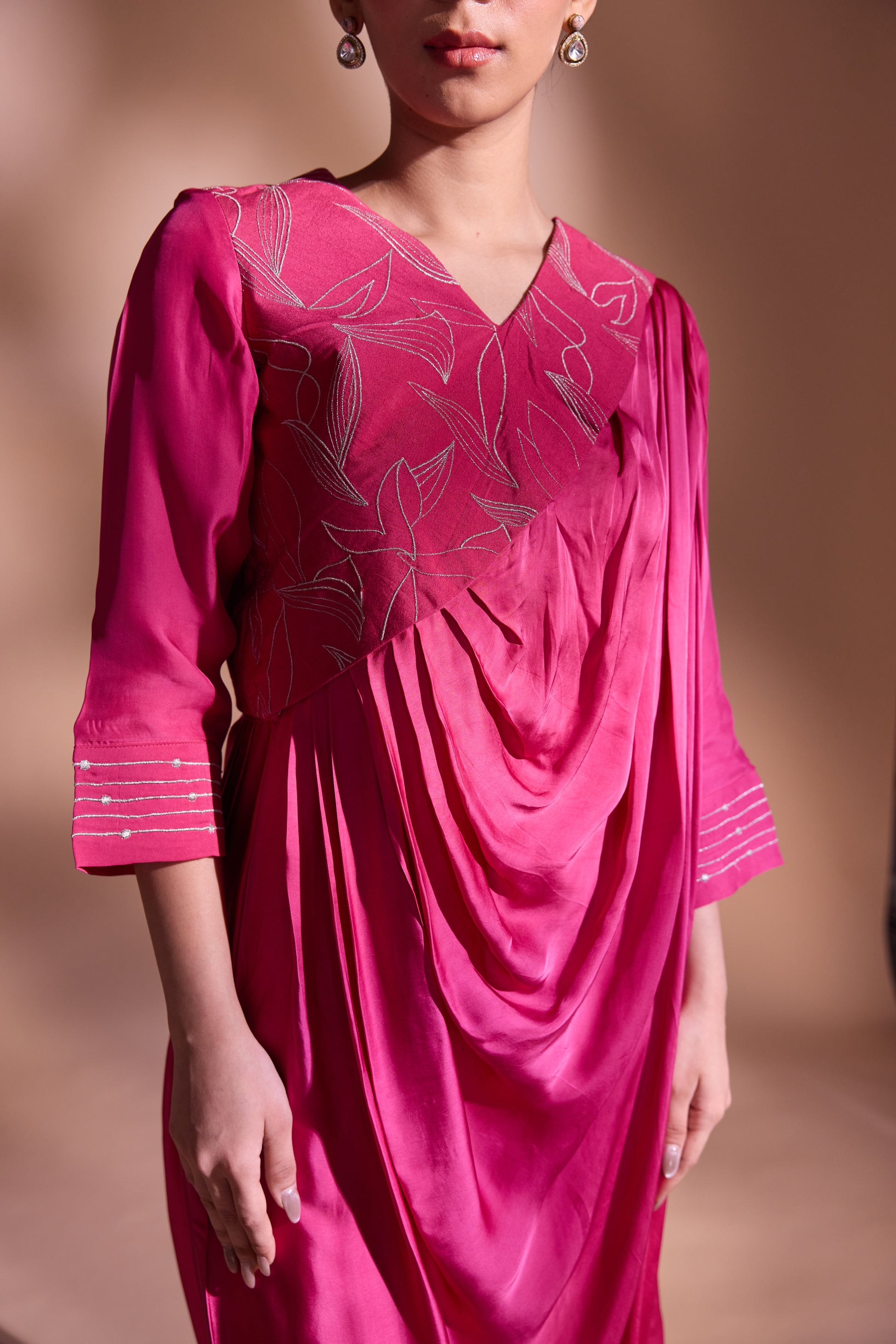 Elevate your ethnic wardrobe with this exquisite Asymmetrical Zari Embroidered Cowl Kurta Set, crafted in luxurious Georgette Satin for a rich and graceful drape. The kurta features a unique asymmetrical silhouette with elegant zari embroidery that adds a touch of opulence to the cowl design. Intricate embroidered detailing on the sleeves enhances its festive appeal, making it perfect for special occasions. Paired with straight-cut pants adorned with delicate embroidery on the hem, this ensemble blends tradition with